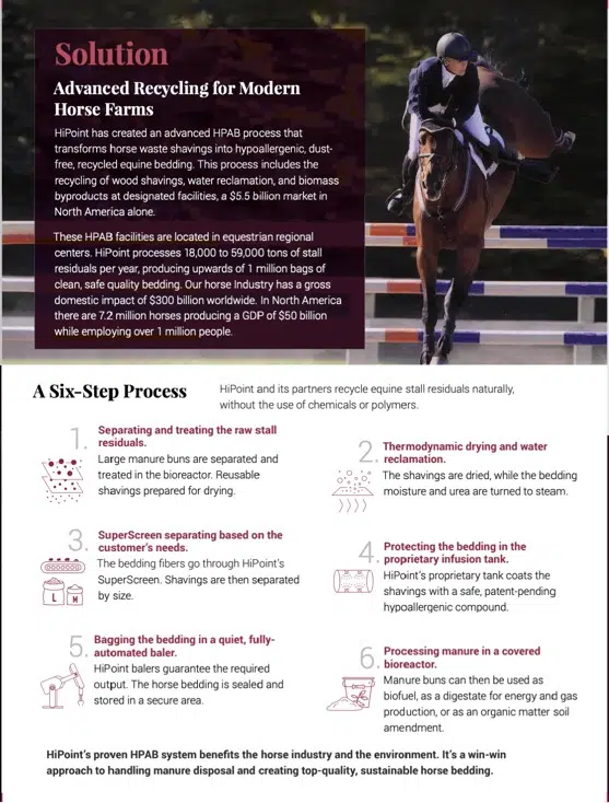 HiPoint AG media Turning Horse Manure into Biofertilizer in Days with Bioreacotor Technology Discover how HiPoint AG’s bioreactor turns horse manure Read more HiPoint Ag named in 2024 NPC Game Changers Report HiPoint AG was selected as one of 80 Read more The HiPoint Story HiPoint Bedding Corp is a Zero Waste Environmental Read more NonPoint Source Pollution through HiPoint Ag HiPoint and the Horse Industry can help reduce Read more HiPoint invited to GIS 2021 from Royal Family It was an incredible honor to be invited Read more HiPoint Proprietary Infusion Tank Overall, HiPoint Infusion ™ improves animal health, allow Read more FEATURED ARTICLES Watch HiPoint AG's Videos on the April 2025 Pre-Commercial Sample TrialsCycle through below on this page, or follow the link to our YouTube ChannelYouTube > Full Playlist April 2025 HiPoint Shavings Testimonials Full Playlist April 2025 HiPoint Shavings Testimonials Full Playlist April 2025 HiPoint Shavings Testimonials Full Playlist April 2025 HiPoint Shavings Testimonials Full Playlist April 2025 HiPoint Shavings Testimonials Full Playlist April 2025 HiPoint Shavings Testimonials Full Playlist April 2025 HiPoint Shavings Testimonials Full Playlist April 2025 HiPoint Shavings Testimonials HiPoint Samples Apr 2025 HiPoint Samples Apr 2025 HiPoint Samples Apr 2025 HiPoint Samples Apr 2025 HiPoint Samples Apr 2025 HiPoint Samples Apr 2025 HiPoint Samples Apr 2025 HiPoint Samples Apr 2025 Full Playlist HIPOINT AG CORPORATE VIDEOS Full Playlist HIPOINT AG CORPORATE VIDEOS Full Playlist HIPOINT AG CORPORATE VIDEOS Full Playlist HIPOINT AG CORPORATE VIDEOS Full Playlist HIPOINT AG CORPORATE VIDEOS HIPOINT AG VIDEOS HIPOINT AG VIDEOS HIPOINT AG VIDEOS HIPOINT AG VIDEOS HIPOINT AG VIDEOS Transportation Emissions The emissions produced by a 52-foot truck and Read more Manure Ch4 Emissions from horses Statistically, through FAOSTAT, 10% of all livestock manure Read more NonPoint Source Pollution through HiPoint Ag HiPoint and the Horse Industry can help reduce Read more Saving Deforestization How can HiPoint save 4.5 million cubic feet Read more EPR Zero Technology Extended Producer Responsibility (EPR) is an environmental policy Read more ESG ARTICLES FEB 2023 The HiPoint Story: Who We are JAN 2024 HiPoint Partners with EFC Foundation MAR 2024 HiPoint Ag Earns a Top Spot in Thrive Canada HiPoint Invited to GIS 2021 by Royal Family NOV 2021 APR 2022 UK Equine Respiratory Disease Problem SEP 2023 HiPoint Presents Waste Program to Nevada FEB 2021 Charities urge EU to stop certain biomass for energy APR 2019 HiPoint Proprietary Infusion Tank MAY 2021 HiPoint Ag Company and Facility FAQ's Non-Point Source Pollution Prevention DEC 2021 MAY 2022 HiPoint Ag Partners with N4L Lotions SEP 2021 European Pollution of Agricultural Lands HIPOINT AG ARTICLES FEB 2023 The HiPoint Story: Who We are MAR 2024 HiPoint Ag Earns a Top Spot in Thrive Canada SEP 2022 HiPoint Presents Waste Program to Nevada APR 2022 UK Equine Respiratory Disease Problem HiPoint Invited to GIS 2021 by Royal Family NOV 2021 NOV 2021 Charities urge EU to stop certain biomass for energy Non-Point Source Pollution Prevention DEC 2020 FEB 2021 HiPoint Ag Partners with N4L Lotions NOV 2019 HiPoints Relationship with Equine for Change(EFC-F) DEC 2019 European Pollution of Agricultural Lands SEP 2019 APR 2019 HiPoint Proprietary Infusion Tank HiPoint Ag Company and Facility FAQ's HIPOINT AG ARTICLES